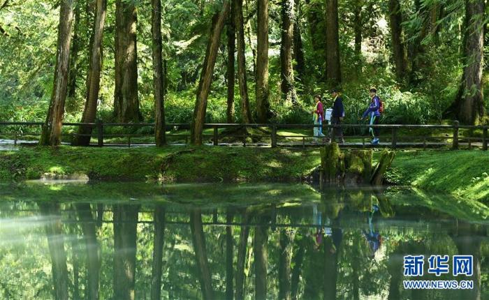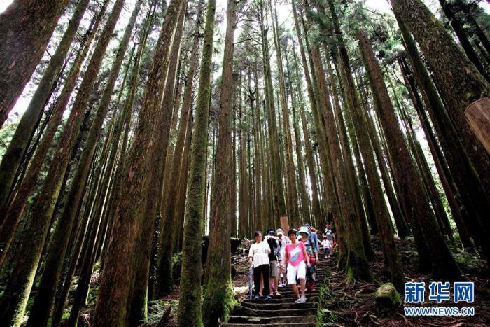 游客在台湾阿里山的葱翠林木中游览(2016年8月5日摄)