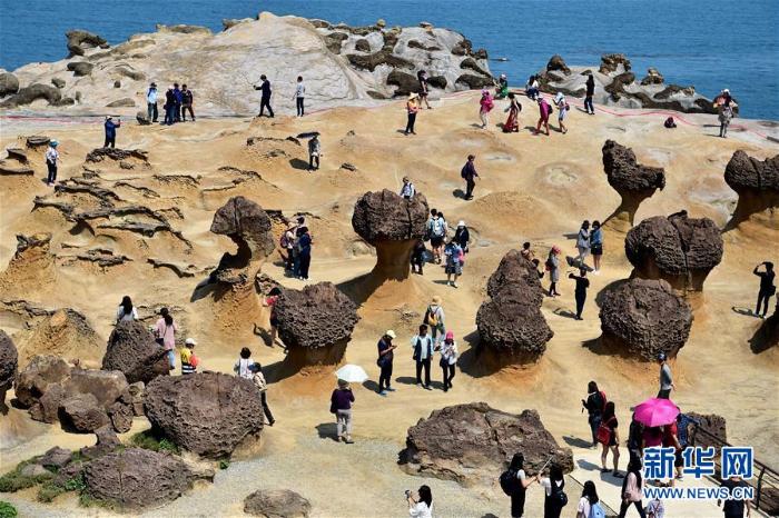 2017年4月5日,游客在台湾野柳地质公园内游玩