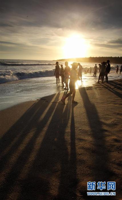 2016年8月3日,游客在夕阳下的台湾垦丁白沙湾游玩