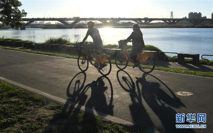 2016年12月19日,游客在台湾台北淡水河沿岸的自行车专用道骑行游玩