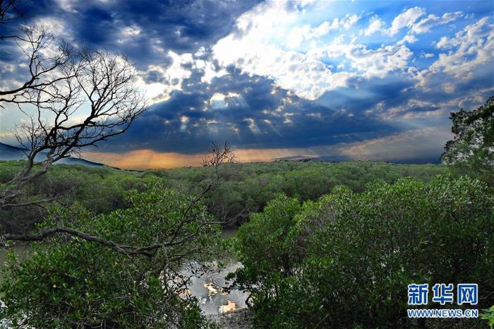 这是4月25日拍摄的夕阳下的台湾淡水河边红树林
