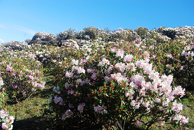 汽车到达了热柯觉乡,公路两旁的一簇簇索玛花已盛开着,不时地映入眼帘。“这算什么索玛花嘛,到上边海拔3000米的波洛山时,那才是真的索玛花海。”朋友说道。“看,那是白雪还是索玛花海哦?”朋友打开了车窗向远处指去。一片银色的世界扑面而来,天地之间全是雪的世界,花的海洋,使人不禁浮想起银装素裹的冬天。绿荫中的花一闪一闪的,使人眼帘随之豁然大开,我们深深地呼吸着索玛花海的芳香,舒展着疲惫的身心。
