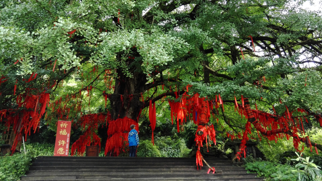 在四川唐家河国家级自然保护区内遗存着一株古银杏树,默立青山千年,历经雨雪风霜,见证着唐家河的岁月变迁,守护着生灵在这里栖息。 唐家河国家级自然保护区位于四川省青川县境内,东接青川东阳沟省级自然保护区,西与绵阳市的平武县毗邻,在保护区白果坪保护站红军桥北,沿着公路,步行数十步,老银杏显而易见,它高约25米,胸径4.5米,树冠20米左右,为雄性,只开花不结果,伟岸苍劲,状如华盖。 银杏树有“活化石”之称,又称公孙树、白果树,是世界上现存种子植物中最古老的孑遗植物,为我国特产,列为世界珍贵树种。据考证这株银杏树已有千岁,一直岿然不动生长于此,闻名遐迩,素有“银杏王”之称。相传,三国时期邓艾偷渡阴平时在此处安营扎寨,当夜想到因摩天岭裹毡损兵折将,孤军深入蜀地困难重重,万一有所闪失,后果不堪设想,不由得思虑重重,难以入眠,恍惚中,见一黄袍老者走进营帐中,对他说:“将军得千古功名便在今日,怎可瞻前顾后,错失良机,若将军明日解我刀斧加身之劫,我必助将军安渡阴平,一举灭蜀。”言罢,化作一群黄蝶而去。邓艾惊醒之后,细想梦中情景,终于决定第二天便进军,第二天一早,将士们正准备砍掉这棵银杏来烧饭,突然,邓艾忆起梦中老者所说“刀斧之劫”,急忙喝止兵士,并上前焚香祷告一番,果然,邓艾偷渡阴平,经江油关(今南坝)、涪城(绵阳),真的一举灭掉了蜀国,老银杏也由此披上了一层神奇的色彩。 寒来暑往,老银杏承载着大自然四季演绎的情感,春暖花开时,沐浴着沥沥小雨,抽出稚嫩的绿叶;浓情夏日时,忍受着炙烤酷暑,乘风摇曳满树扇叶,郁郁葱葱,向人们送去清凉;秋意盎然时,满树穿着金色的外衣,耀眼夺目,盈满人们的双眼;寒冬腊月时,风雪袭来,剩下一树枯瘦的枝丫,等待新一轮的勃勃生机。 岁月更迭,老银杏从古老走进现代,苍老的皮肤上写满了它从对唐家河历史的见证,从三国战事纷争到红军浴血奋战,从第四纪冰川侵蚀到5.12汶川地震,从唐家河森林经营所、伐木场的建立到自然保护区成立,如今,唐家河依然保留着世界本来的样子....老银杏像个寡言的哲人,把这一切都看在眼里,记在心头。 这些年,唐家河里慕名而来的旅游的人日益增多,老银杏让更多的善男信女透过它感受佛光普照的无边温暖,树枝上飞扬的红丝带扎满了信徒们虔诚的心愿,祈求平安多福、子孙满堂。老银杏携着悠久的传说,挽着古老的文明,穿越历史风烟,行至今日,以千古的灵性承载着众生美好的祈愿,以清幽的姿态涤荡浮世尘嚣,守护着唐家河这块和谐安宁的净土,守护着唐家河的精灵们在这里繁衍生息。 因为来到老银杏树下祈福和照相的人越来越多,有时一天来好几千人。来的人多了,我们就怕对这古树有影响,所以作为护林人的我们,要做的就是继续守护好这株老银杏。老银杏是历史和前人留给我们的宝贵财富,它连接着历史,记录着现在,影响着未来,保护好老银杏,为后代留下珍贵的资源,是我们义不容辞的责任,更是护林人责任旁贷的任务。 老银杏的周围还埋葬着王姓人的祖先,他们一直把这里当成风水宝地。