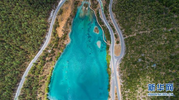 这是云南丽江玉龙雪山蓝月谷景色(4月21日无人机拍摄) 新华社记者发