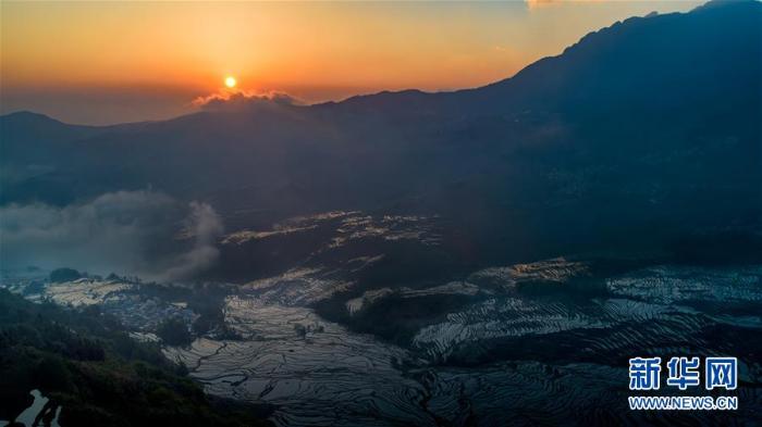 在云南省元阳县拍摄的晨曦中的哈尼梯田(4月4日无人机拍摄) 新华社记者发