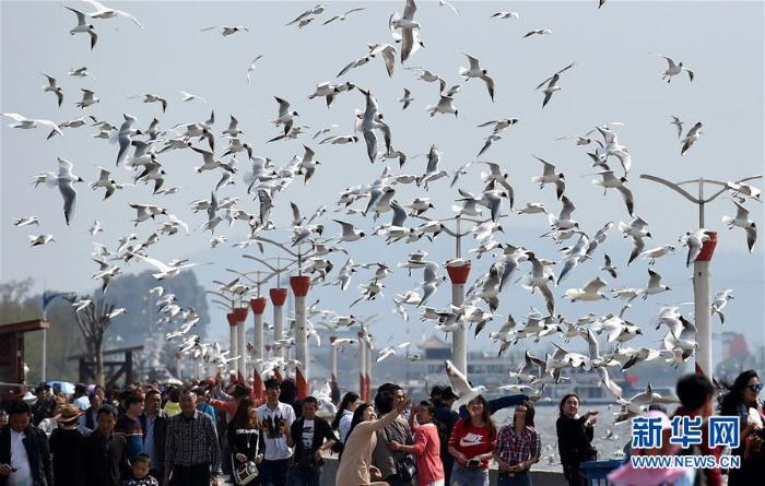 人们在昆明滇池边与红嘴鸥嬉戏(2016年3月15日摄) 新华社记者发
