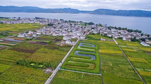 云南省大理白族自治州大理市湾桥镇古生村与当地的库塘污水处理系统(2017年9月11日摄)