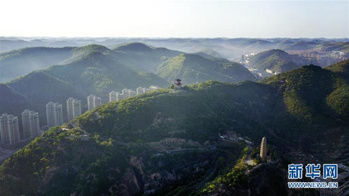 延安市宝塔山(右下)与摘星楼(5月11日无人机拍摄)  新华社记者发