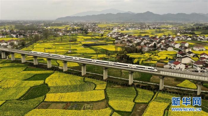 列车通过汉中市南郑区新集镇油菜花海(3月21日无人机拍摄)  新华社记者发