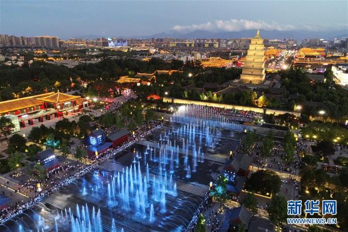日暮时分的西安大雁塔文化休闲景区吸引众多游人游览(7月26日无人机拍摄)  新华社记者发