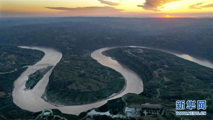 朝霞下的黄河乾坤湾景色(8月14日无人机拍摄)  新华社记者发
