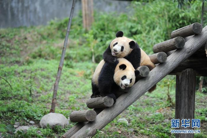 在陕西省珍稀野生动物抢救饲养研究中心,大熊猫“路路”(左)和“强生”在活动区域玩耍(2018年9月7日摄)。大熊猫、朱鹮、金丝猴、羚牛被誉为“秦岭四宝”  新华社记者发
