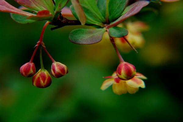 紫叶小檗是一种落叶灌木,枝叶丛生,嫩枝为紫红色,老枝为灰棕色或紫褐色,茎秆表皮具刺,有凹槽。叶片为较小的倒卵形,叶片下表面颜色稍淡,在短枝上簇生,颜色艳丽。花单生或2~5朵呈短的总状花序,花瓣为黄色,边缘有红色的纹晕。一般在4月开花,果熟期为9—10月份,果实呈红色椭圆形。