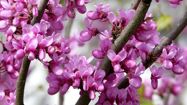 紫荆的花紫红色或者粉红色,2—10余朵成束,簇生在老枝和主干上,通常先于叶开放,但是嫩枝或者幼株上的花则和叶子同时开放。