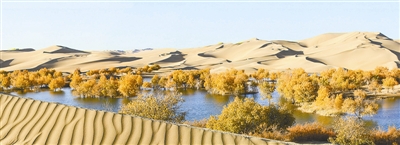 每个人心中都有一个美丽的秋天,不过秋色不尽相同。有的秋叶色彩斑斓,有的硕果浓淡飘香,有的秋景浩渺变幻,有的地貌壮丽神奇,有的秋雾如梦如烟,有的驼影羊群金海闪现。而天然原始胡杨林的秋天融各景于一景,集胡杨景观、自然景观、河流景观、沙漠景观为一体,点缀着一身金黄,迎着微寒的秋风的走来。
