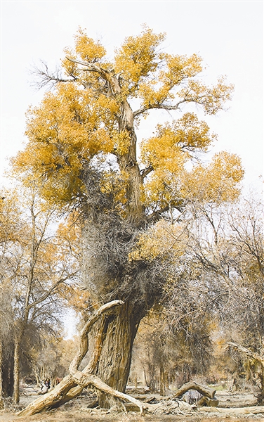 胡杨的祖先在1.35亿年前就出现了,是世界最古老的珍稀树种。在6500万年前,胡杨渐成我国西北河岸林最主要的建群树种。胡杨随河流改道沙化屡屡迁徙,它曾驻足的痕迹见证了中国西北走向荒漠化的过程。而今胡杨林仍然犹如一条条绿色长城锁住大漠的扩张。胡杨具有生态、科研、经济、医学、审美价值。原始胡杨林金秋的色彩盛宴,闪烁着世代与旱漠角力和应变的辉煌,给人们的是一种触及心灵的震撼。