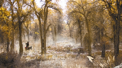 当阵阵秋风迎来霜降节气,塔里木河流域那3800平方公里的胡杨叶子在阳光的照耀下透亮、跳跃,在蓝天腾升起一层层、一朵朵铺天盖地的金色彩云。那在狂风暴沙中坚强不屈的枝干闪烁着胡杨世世代代与旱漠对视、角力和应变的辉煌。