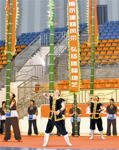 挑幡是选用一根十米长的粗壮结实毛竹竿,毛竹竿加工后装饰彩灯、宝塔、铜铃、宝幡以及宝幡上绣褒颂之词。在热烈的锣鼓声中,表演者时而把幡竿扛肩,时而脚踢,时而头顶,时而牙咬,甚至用鼻托住幡竿,动作惊险,惊心动魄。1996年上海大世界基尼斯总部赞誉福建建瓯挑幡为“天下第一,绝无仅有”的绝技,1998年建瓯挑幡正式荣获上海大世界基尼斯总部颁发的“大世界基尼斯之最”证书,列入《基尼斯大全》。
