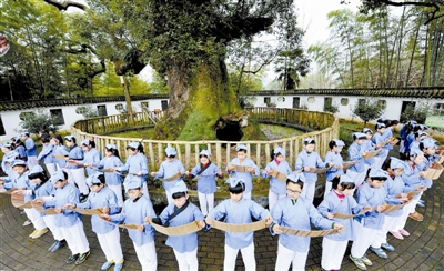 江西省德兴市海口镇海口村是一个千年古村,历史上曾有179名村民考中进士。村里有一棵近2000岁高龄的巨型古樟树,树围达23米、树高20米,整棵树要16个成年人伸开双臂才能合围,树蔸内有一个可容纳60多人的树洞。图为身穿古装的学童们在千年古樟下诵读经典国学。