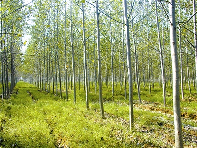 太阳纸业营建的4年生三倍体毛白杨纸浆林