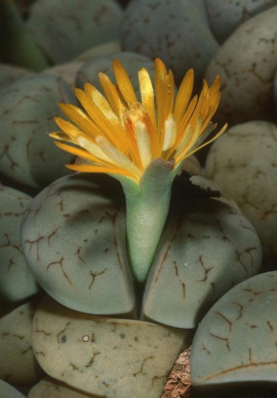 原产非洲南部及西南地区,常见于岩床缝隙、石砾之中。生石花形如彩石,色彩丰富,娇小玲珑,享有"有生命的石头"的美称。