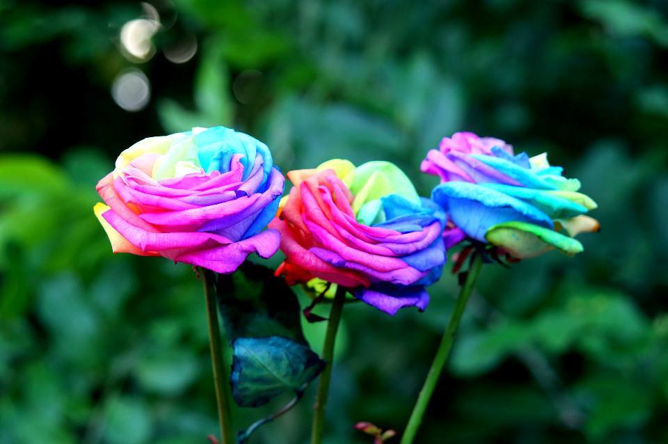 彩虹玫瑰(Rainbow Rose)并不是一个物种,是白玫瑰吸收各种色素,形成了如此娇艳的彩虹玫瑰,这种玫瑰一朵花上有几种颜色,摸上去感觉像绒布,颜色和毛绒绒的感觉是通过人工手段制作的,由于颜色是后期渲染所以有时候会出现掉色的情况,当然不会严重正常只会是在经过碾压破损后出现掉色的。就是正常鲜花破损碾压也是会掉色因为它们是含有色素的。