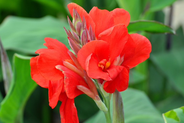 美人蕉(学名:Canna indica L.):多年生草本植物,高可达1.5米,全株绿色无毛,被蜡质白粉。具块状根茎。地上枝丛生。单叶互生;具鞘状的叶柄;叶片卵状长圆形。总状花序,花单生或对生;萼片3,绿白色,先端带红色;花冠大多红色,外轮退化雄蕊2-3枚,鲜红色;唇瓣披针形,弯曲;蒴果,长卵形,绿色,花、果期3-12月。