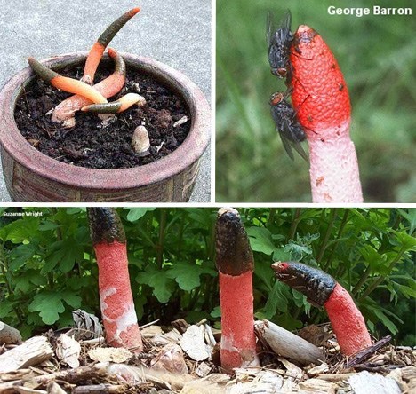 蛇头菌学名为"Mutinus Caninus",可以称得上是最丑陋的菌类。蛇头菌菌柄呈圆柱形,菌盖呈鲜红色,菌盖顶端长有恶臭气味的粘稠状孢子。
