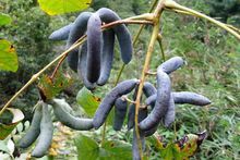猫屎瓜属木通科(Lardizbalaceae),丛生落叶灌木。高达2~6米,树皮深灰棕色,幼枝黄绿色,茎中髓心粗大,色白而疏松;大型奇数羽状复叶,长达50厘米,互生,小叶13~25片,对生,卵圆形或矩圆形。顶端渐尖,基部宽楔形,全缘,叶表面淡绿色,背面灰白色,总叶柄和小叶柄基部膨大,具明显关节;圆锥花序顶生,下垂,花杂性,两性花,黄绿色,钟状;浆果圆柱状,通常微弯曲,长5~15厘米,幼嫩时绿色,成熟后变蓝色或蓝紫色,多浆汁,形如猫屎;种子扁平,长圆形,黑色,长约1厘米。花期5~6月,果熟10~11月。猫屎瓜是一种很有开发价值的野生经济植物。果实营养丰富,果肉中富含糖类蛋白质、脂肪、果胶、维生素和矿物营养。味甜如蜜,可供鲜食和加工制糖、酿酒、食品、果胶果冻、果酱等。其种子含油量为18%~22%,出油率与棉籽相近,油可食用,其味香美,富有营养,还可制肥皂,做工业用油。其果皮内富含橡胶,含量约为干重的10%~20%,且橡胶的化学结构和一般天然橡胶相同,与丁苯胶掺和使用,可作一般橡胶制品。