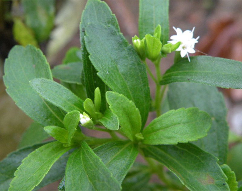 甜叶菊(学名:Stevia rebaudiana (Bertoni) Hemsl.)是菊科、甜叶菊属多年生草本植物。 株高1-1.3米。根梢肥大,50-60条,长可达25厘米。茎直立,基部梢木质化,上部柔嫩,密生短茸毛,花冠基部浅紫红色或白色,上部白色。瘦果线形,稍扁,褐色,具冠毛。花期7-9月,果期9-11月。