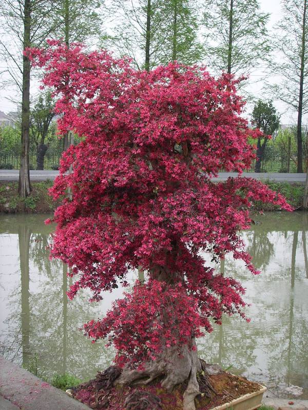 红花檵木(拉丁学名:Loropetalum chinense var.rubrum),又名:红继木、红梽木、红桎木、红檵花、红梽花、红桎花、红花继木,为金缕梅科、檵木属檵木的变种,常绿灌木或小乔木。树皮暗灰或浅灰褐色,多分枝。嫩枝红褐色,密被星状毛。叶革质互生,卵圆形或椭圆形,长2~5cm,先端短尖,基部圆而偏斜,不对称,两面均有星状毛,全缘,暗红色。花瓣4枚,紫红色线形长1~2cm,花3~8朵簇生于小枝端。蒴果褐色,近卵形。花期4~5月,花期长,约30~40天,国庆节能再次开花。花3~8朵簇生在总梗上呈顶生头状花序,紫红色。果期8月。