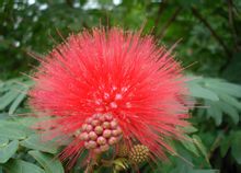 落叶灌木,二回羽状复叶,叶互生,小叶对生,小叶为披针形或歪长卵形。花冠呈圆球形,伞形花序,丝绒状花序为雄蕊,花丝艳红色,聚成红色可爱的小红绒球。同属种类有朱缨花和大朱缨花。