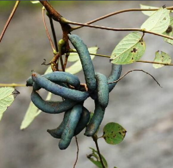 猫儿屎(Decaisnea insignis (Griff.) Hook. f. et Thoms.),别名猫屎瓜、矮杞树等。直立灌木,高5米。茎有圆形或椭圆形的皮孔;枝粗而脆,易断。羽状复叶长50-80厘米;叶柄长10-20厘米;小叶膜质,卵形至卵状长圆形。总状花序腋生,或数个再复合为疏松、下垂顶生的圆锥花序;小苞片狭线形。花丝合生呈细长管状,花药离生。雌花:退化雄蕊花丝短,合生呈盘状;心皮3,圆锥形,柱头稍大,马蹄形,偏斜。果下垂,圆柱形,蓝色,顶端截平但腹缝先端延伸为圆锥形凸头,具小疣凸,果皮表面有环状缢纹或无;种子倒卵形,黑色,扁平,长约1厘米。花期4-6月,果期7-8月。
