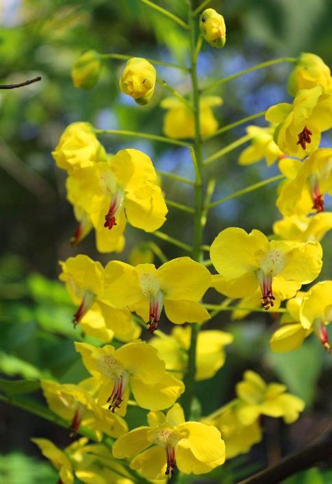 云实(学名:Caesalpinia decapetala (Roth) Alston):藤本;树皮暗红色;枝、叶轴和花序均被柔毛和钩刺。二回羽状复叶长20-30厘米;羽片3-10对,对生,具柄,基部有刺1对;小叶8-12对,膜质,长圆形,两面均被短柔毛,老时渐无毛。总状花序顶生,直立,长15-30厘米,具多花;花瓣黄色,膜质,圆形或倒卵形,长10-12毫米,盛开时反卷,基部具短柄。荚果长圆状舌形,脆革质,栗褐色,无毛,有光泽,沿腹缝线膨胀成狭翅,成熟时沿腹缝线开裂,先端具尖喙;种子6-9颗,椭圆状,种皮棕色。花果期4-10月。