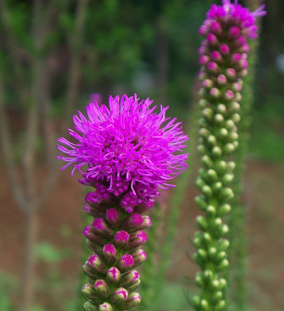蛇鞭菊(学名:Liatris spicata (L.) Willd):多年生草本植物。茎基部膨大呈扁球形。花红紫色。花期夏、秋季。因多数小头状花序聚集成密长穗状花序,小花由上而下次第开放,好似响尾蛇那沙沙作响的尾巴,呈鞭形而得名。是一种宿根植物,蛇鞭菊花期长,自然花期盛夏。花茎挺立,花色清丽,不仅有自然花材之美,而且具美好的花寓意。