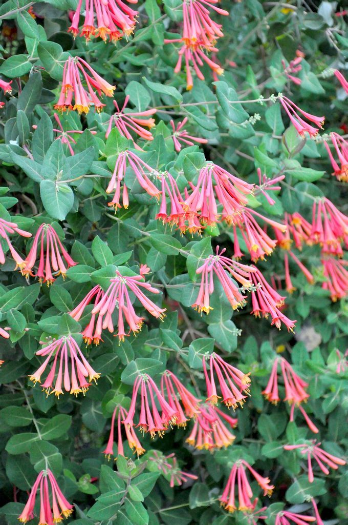 垂红忍冬(学名:Lonicera brownii 'Dropmore Scarlet')是忍冬科,忍冬属垂贯月忍冬(Lonicera sempervirens)和毛忍冬(Lonicera hirsutha)的杂交种布朗忍冬的栽培品种。落叶灌木,高可达2.5米,小枝纤细,叶片纸质,很少对生,条状披针形、矩圆状披针形至矩圆形,上面无毛或有微腺毛,叶下面无毛或疏生短柔毛。花生于幼枝基部叶腋,芳香,总花梗极短;苞片叶状,条状披针形至条状倒披针形,萼齿狭披针形,花冠淡紫色或紫红色,筒状钟形,裂片卵形,花药达花冠筒的上部;花柱高达花冠筒之半,果实红色,椭圆形,种子淡褐色,矩圆形,扁,5-8月开花,8-10月结果。