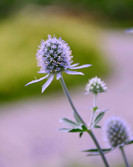 扁叶刺芹,伞形科 刺芹属 ,多年生草本。高约75cm,茎灰白色、淡紫灰色至深紫色坚硬光滑,上部分枝。基生叶长椭圆状卵形,边缘有粗锯齿。头状花序着生于每一分枝顶端,圆卵形、阔卵形或半球形;花浅蓝色,花瓣萼片互生,膜质透明。果实长椭圆形,卵形或近圆形,花果期7-8月。扁叶刺芹是一种典型的干旱植物,即使是在恶劣环境里也充满活力,直立的茎叶,漂亮的蓝色花序,是一种很好的切花干燥花