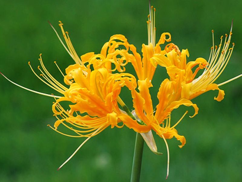 忽地笑(学名:Lycoris aurea (L'Hér.) Herb)草本,地生。鳞茎卵形;叶剑形;伞形花序,有花4-8朵,花黄色;花被裂片背面具淡绿色中肋,雄蕊略伸出于花被外,花丝黄色;蒴果具三棱,室背开裂;种子少数,近球形。