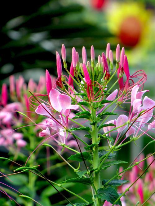 醉蝶花(学名:Cleome spinosa Jacq.):一年生草本植物。花茎直立,株高40厘米-60厘米,有的品种可达1米, 其茎上长有粘汁细毛,会散发一股强烈的特殊气味;叶片为掌状复叶,小叶5枚-7枚,为矩圆状披针形;总状花序顶生,花由底部向上次第开放,花瓣披针形向外反卷,花苞红色,花瓣呈玫瑰红色或白色,雄蕊特长;蒴果圆柱形,种子浅褐色。花期在6月-9月,其花茎长而壮实,花朵盛开时,总状花序形成一个丰满的花球,朵朵小花犹如翩翩起舞的蝴蝶,非常美观。 中国无野生,各大城市常见栽培。原产热带美洲,全球热带至温带栽培以供观赏,也是一种优良的蜜源植物