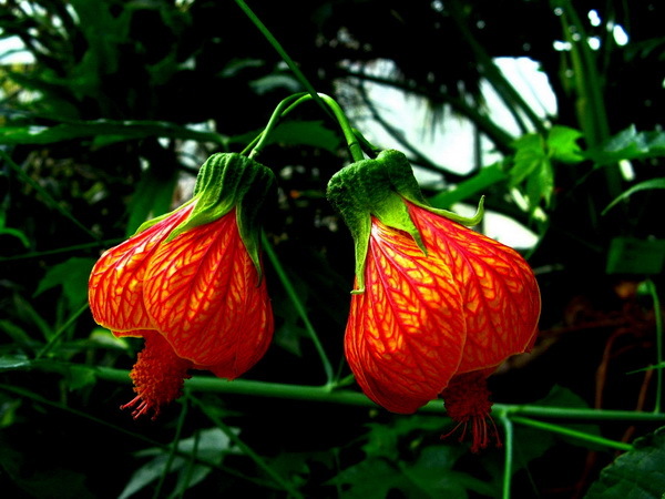 花腋生,花柄长而细的,花朵橙红色,具红色纹脉,瓣端向内弯,似钟形显得美丽而可爱。一朵朵半展开状的花朵挂在柔软的枝条上,迎风摇曳,像一串串发音清脆的风铃。