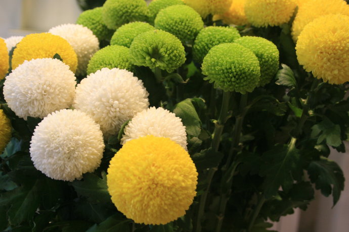乒乓菊是菊科的一种植物,因为外形像乒乓球而得名,有黄、绿、白、红四种颜色,常作为鲜切花使用,原产自日本。乒乓菊造型讨巧、可爱,而且保鲜时期较长,代表爱情圆满长久。