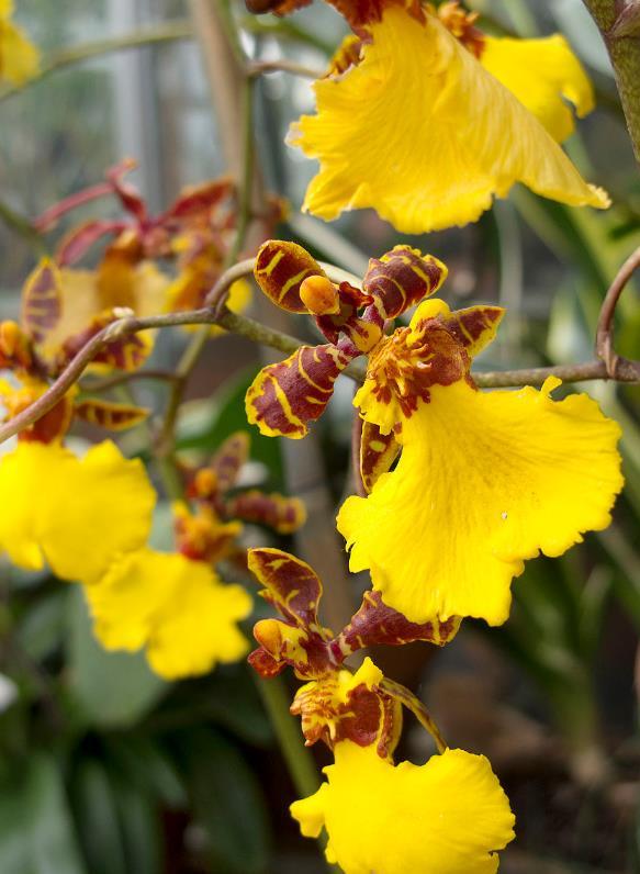 文心兰(学名:Oncidium hybridum),又名吉祥兰,跳舞兰、舞女兰、金蝶兰、瘤瓣兰等,叶片1~3枚,可分为薄叶种,厚叶种和剑叶种。兰科中的文心兰属植物的总称,本属植物全世界原生种多达750种以上,而商业上用的千姿百态的品种多是杂交种,植株轻巧、潇洒,花茎轻盈下垂,花朵奇异可爱,形似飞翔的金蝶,极富动感,是世界重要的盆花和切花种类之一。它的故事波及深远,相传宋美龄访白宫之时,一见钟情于此花,发现花瓣像极了中国汉字中的“吉”字,寓意吉祥,因此取名为“吉祥兰”。