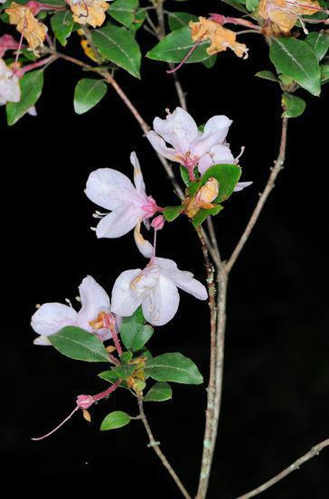 马银花(学名:Rhododendron ovatum (Lindl.) Planch. ex Maxim.):常绿灌木,高2-4米;小枝灰褐色,疏被具柄腺体和短柔毛。叶革质,卵形或椭圆状卵形,上面深绿色,有光泽,下面仅中脉凸出,侧脉和细脉不明显,无毛。花单生枝顶叶腋;花冠淡紫色、紫色或粉红色,辐状,5深裂,裂片长圆状倒卵形或阔倒卵形。蒴果阔卵球形。花期4-5月,果期7-10月。