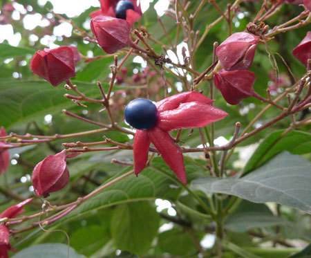 海州常山(学名:Clerodendrum trichotomum Thunb.)别名臭梧桐、泡花桐、八角梧桐、追骨风、后庭花、香楸、泡火桐、海桐、臭桐、臭芙蓉等,花序大,花果美丽,一株树上花果共存,白、红、兰色泽亮丽,花果期长,植株繁茂,为良好的观赏花木,丛植、孤植均宜,是布置园林景色的良好材料。根、茎、叶、花入药,有祛风湿,清热利尿,止痛,平肝降压之效。 海州常山喜光、稍耐阴、喜湿润肥沃壤土,较耐旱,适应性强,有一定耐寒性,忌低洼积水,耐盐碱性较强。