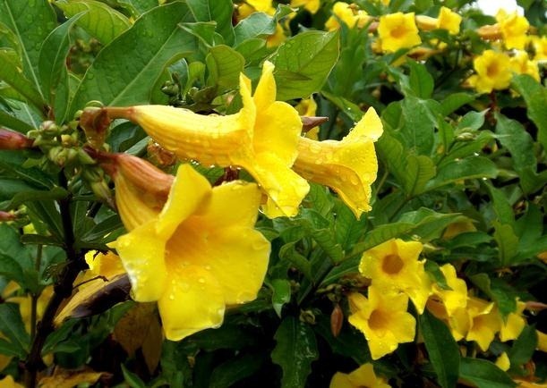 黄蝉(学名:Allemanda neriifolia Hook.):常绿灌木,植株直立生长,高约 2米,盆栽一般控制在1米左右。叶3片至5片轮生,叶片椭圆形或倒披针状矩圆形,叶长5厘米至12厘米,宽1.5厘米至4厘米,被有短柔毛。聚伞花序,花朵金黄色,喉部有橙红色条纹,花冠阔漏斗形,有裂片5 枚,并向左或向右重叠,花冠基部膨大,内部着生雄蕊5枚。蒴果球形,有长刺。 花期5-6月。  原产美国南部及巴西,分布于热带美洲,中国为引入栽培。用于庭园绿化,植株浓密,叶色碧绿,花朵明快灿烂,非常醒目,适宜作大中型盆栽,装饰客厅、阳台、公园及商场、会场等大型室内空间,效果很好。
