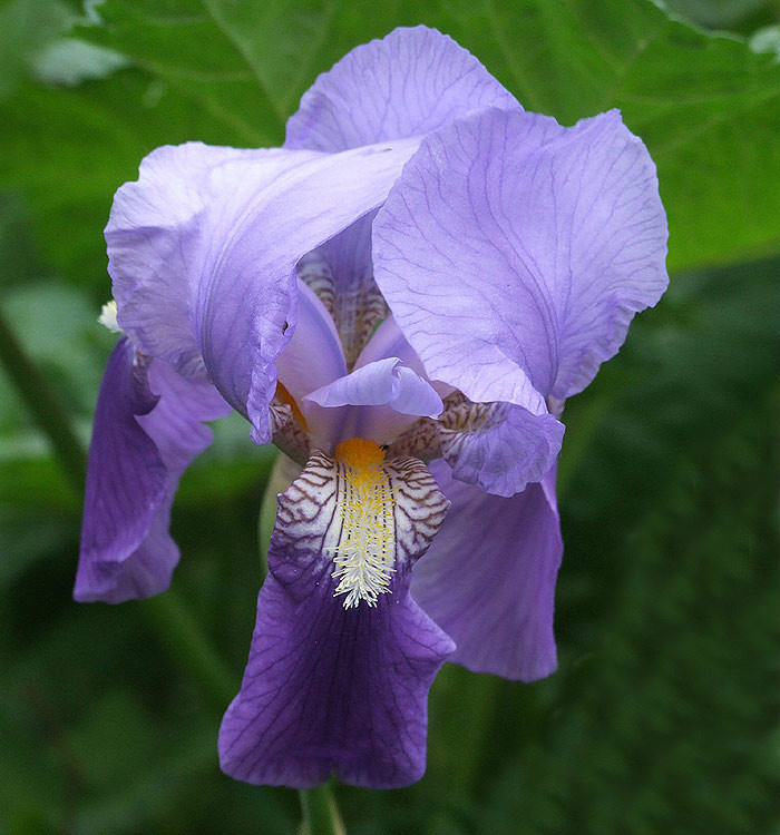 德国鸢尾(学名:Iris germanica L.):多年生草本。根状茎粗壮而肥厚,常分枝,扁圆形,斜伸,具环纹,黄褐色;须根肉质,黄白色。叶直立或略弯曲,淡绿色、灰绿色或深绿色,常具白粉,剑形。花茎光滑,黄绿色,高60-100厘米,上部有1-3个侧枝,中、下部有1-3枚茎生叶;苞片3枚,内包含有1-2朵花;花大,鲜艳,直径可达12厘米;花色因栽培品种而异,多为淡紫色、蓝紫色、深紫色或白色,有香味;花被管喇叭形,长约2厘米,外花被裂片椭圆形或倒卵形,顶端下垂,爪部狭楔形,内花被裂片倒卵形或圆形,长、宽各约为5厘米,直立,顶端向内拱曲,中脉宽,并向外隆起,爪部狭楔形。蒴果三棱状圆柱形,顶端钝,无喙,成熟时自顶端向下开裂为三瓣;种子梨形,黄棕色,表面有皱纹,顶端生有黄白色的附属物。花期4-5月,果期6-8月。
