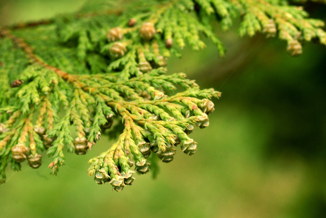 常绿乔木,原产地高40m,胸径1.5m;树冠圆锥形。树皮红褐色,裂成薄片。生鳞叶的小枝背面有白线或微被白粉。鳞叶先端钝,肥厚。雌雄同株,球花单生枝端。