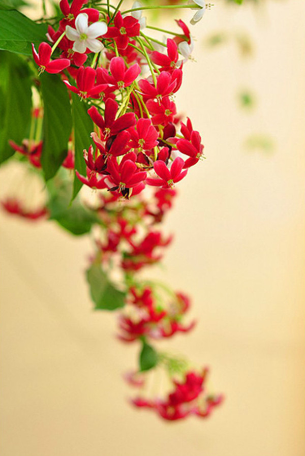 使君子(学名:Quisqualis indica L.)别名:舀求子、史君子、四君子,是使君子科、使君子属攀援状灌木,高2-8米;小枝被棕黄色短柔毛。叶对生或近对生,叶片膜质,卵形或椭圆形,先端短渐尖,基部钝圆,表面无毛,背面有时疏被棕色柔毛,幼时密生锈色柔毛。顶生穗状花序,组成伞房花序式;苞片卵形至线状披针形,被毛;具明显的锐棱角5条,成熟时外果皮脆薄,呈青黑色或栗色;白色,圆柱状纺锤形。花期初夏,果期秋末。种子为中药中最有效的驱蛔药之一,对小儿寄生蛔虫症疗效尤著。