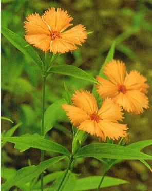 剪夏罗是多年生草本,高50~80厘米。根茎横生,竹节状,表面黄色,内面白色,具条状根。茎直立,丛生,微有棱,节略膨大,光滑。单叶对生,无柄;叶片卵状椭圆形,长6~10厘米,宽2~4厘米,先端渐尖或长渐尖,基部圆形或阔楔形,边缘有浅细锯齿。