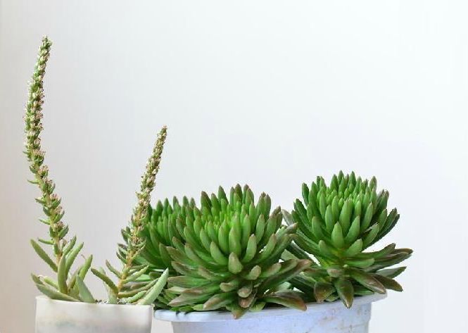 小苞瓦松(学名:Orostachys thyrsiflorus Fisch.):景天科瓦松属二年生草本植物。第一年有莲座丛,叶淡绿,线状长圆形,第二年自莲座中央伸出花茎,高可达20厘米;茎生叶多少分开,有软骨质的突尖头。花序总状,苞片卵状长圆形,萼片三角状卵形,花瓣白色或带浅红色,长圆形,鳞片近正方形至近长方形,蓇葖直立;种子细小卵形。7-8月开花。